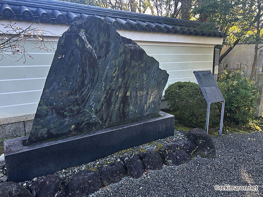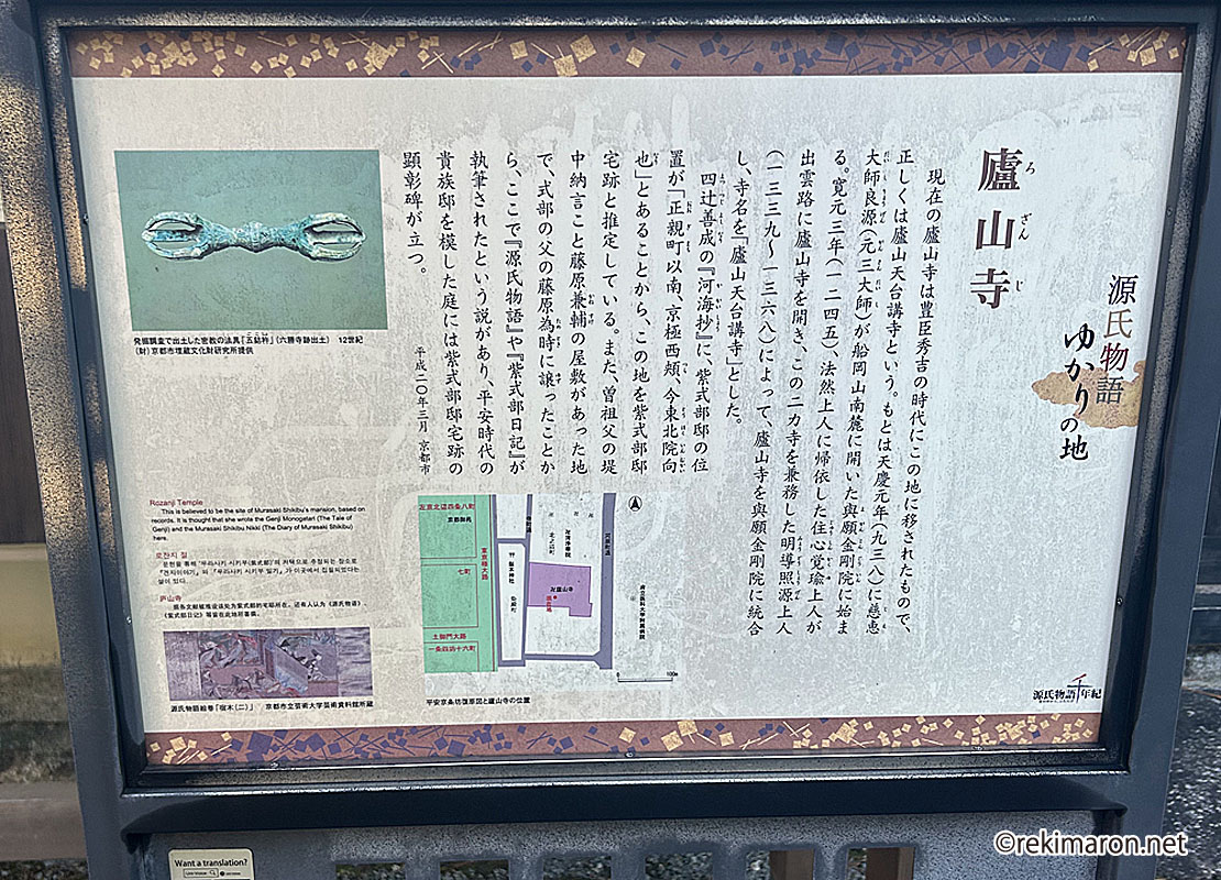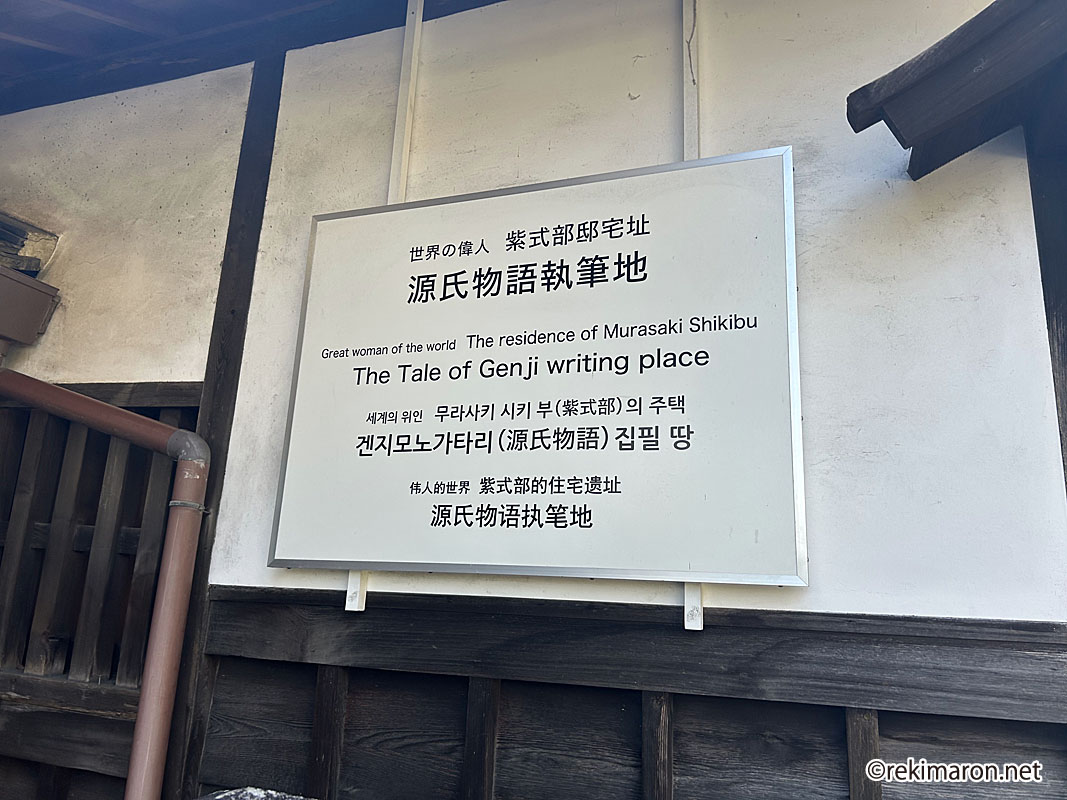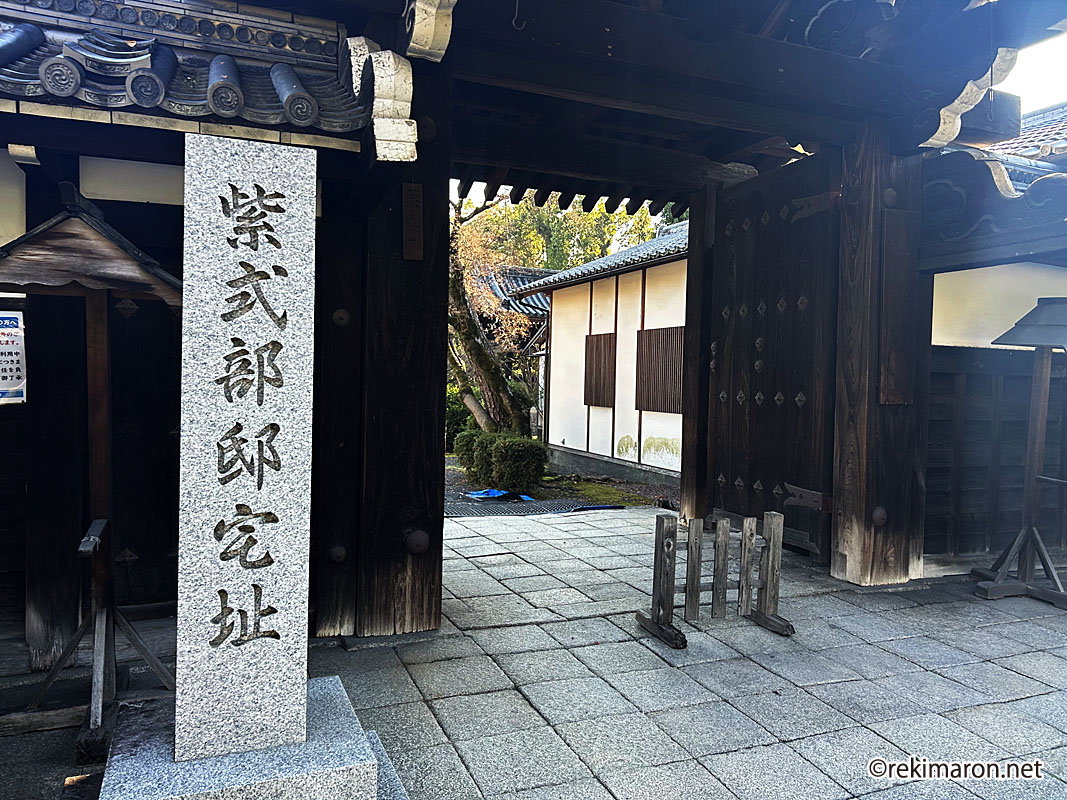 また、曽祖父の堤中納言こと藤原兼輔の屋敷があった地で、式部の父の藤原為時に譲ったことから、ここで『源氏物語』や『紫式部日記』が執筆されたという説があり、平安時代の貴族邸を模した庭には式部邸宅跡の顕彰碑が立つ。」