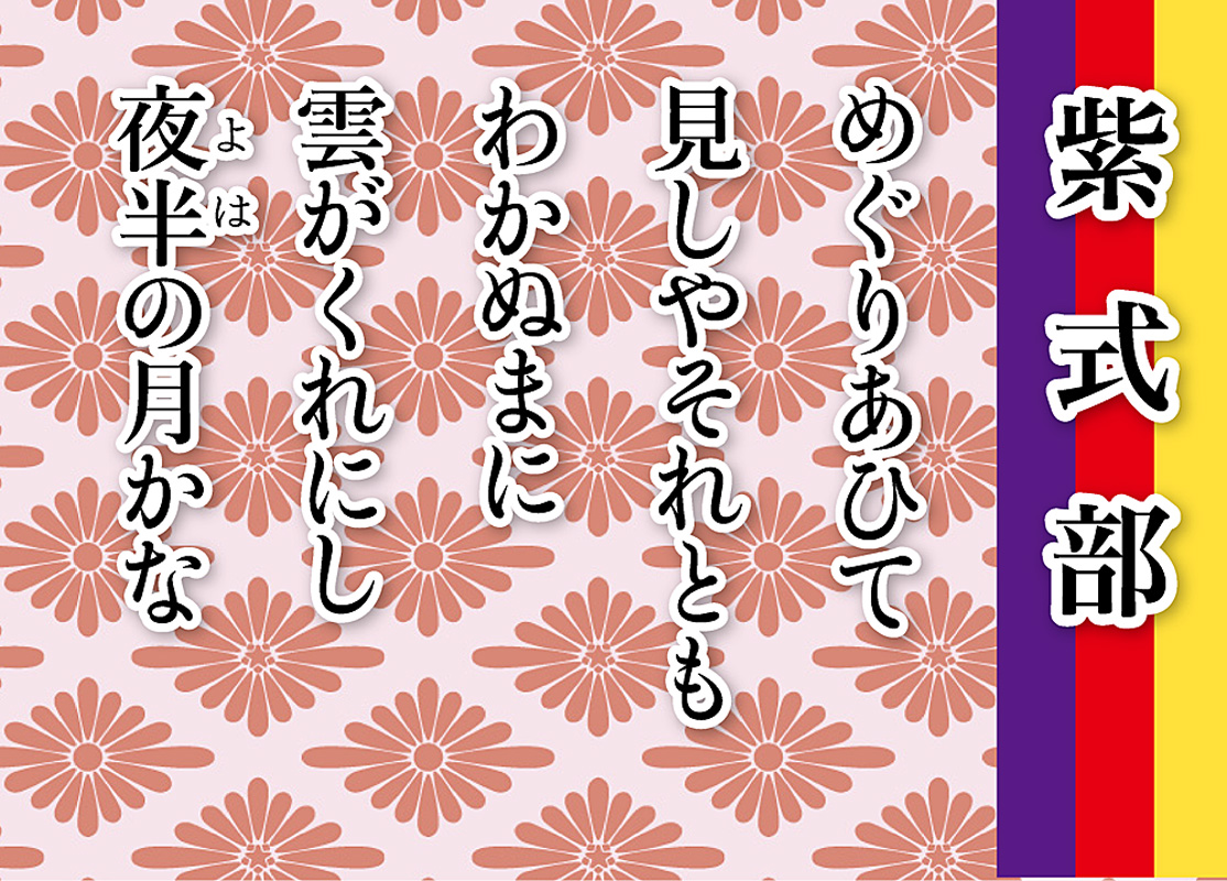 「めぐりあひて 見しやそれとも わかぬまに 雲がくれにし 夜半の月かな」(小倉百人一首57番)ー久しぶりにめぐり会って、それかどうか見分けるまもなく、雲に隠れてしまったあの夜半の月のように、あなたはあわただしく帰ってしまわれた。お名残りおしい事です。ー